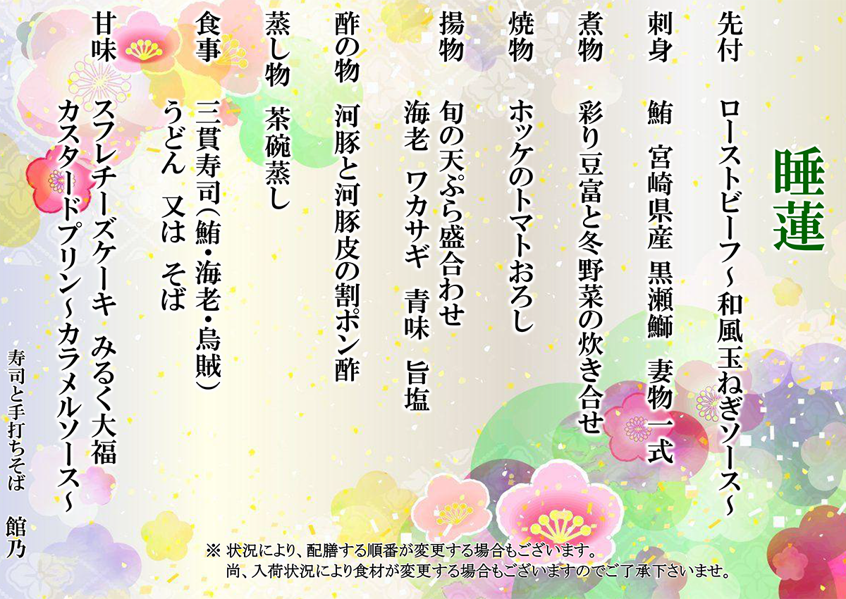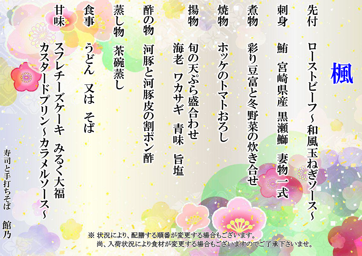 尚、入荷状況により食材が変更する場合もございますので御了承下さいませ。