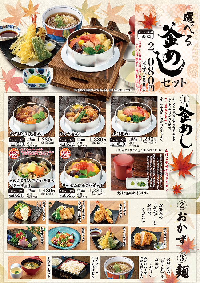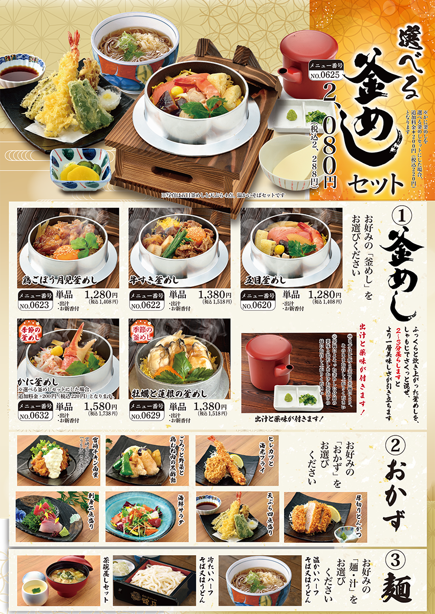5種類の「釜めし」の中からお好きな釜めしと、「おかず」「麺・汁」もお好みのものをお選びいただけるので、色々な組み合わせで何通りもお楽しみいただけます!