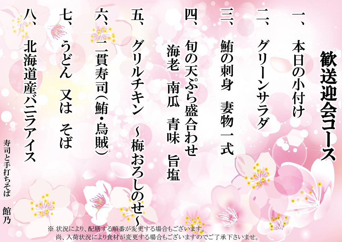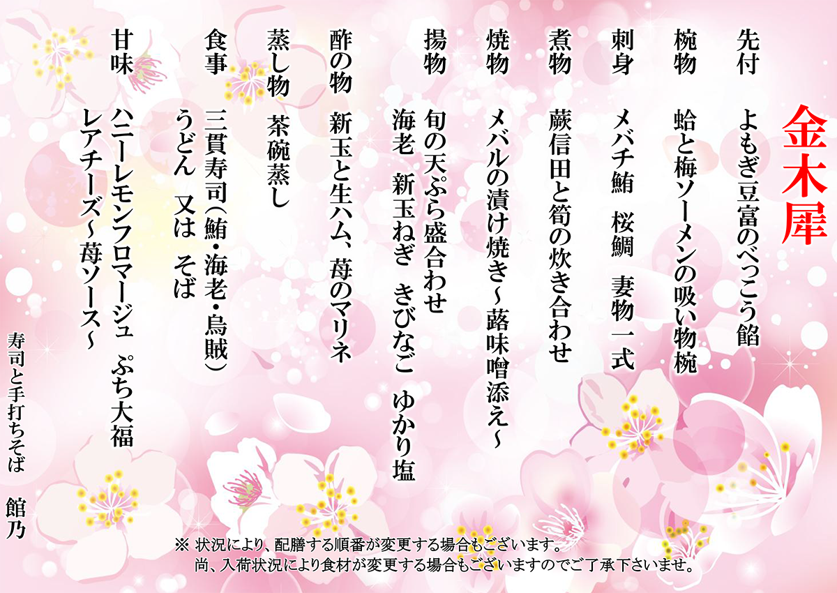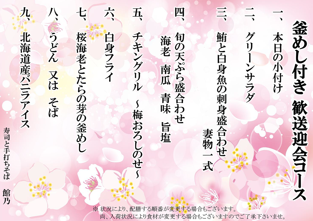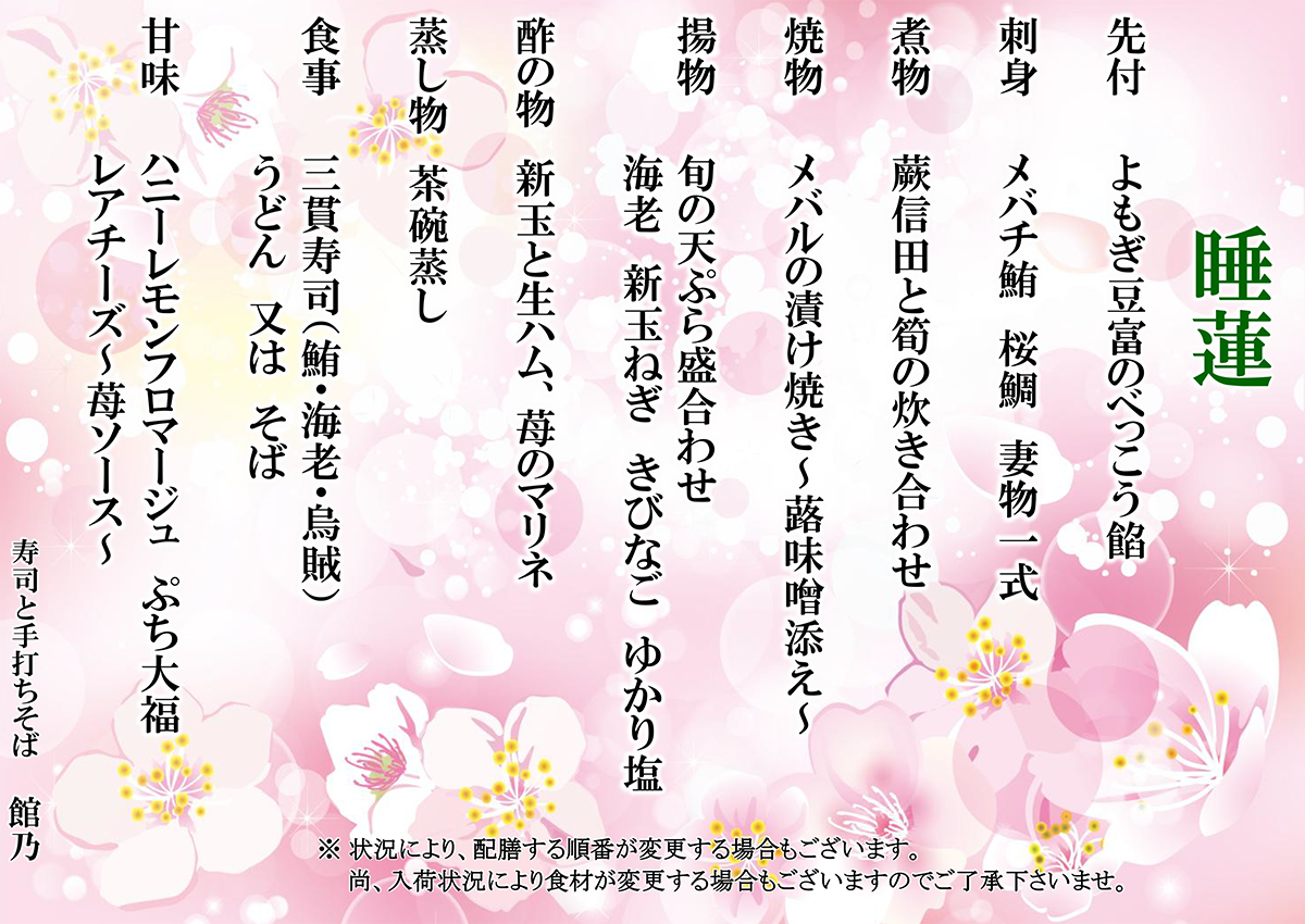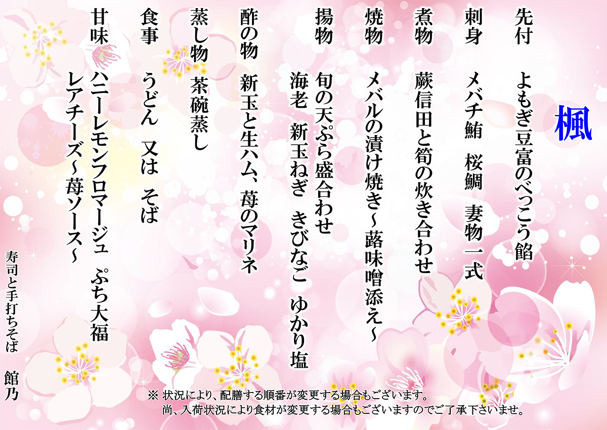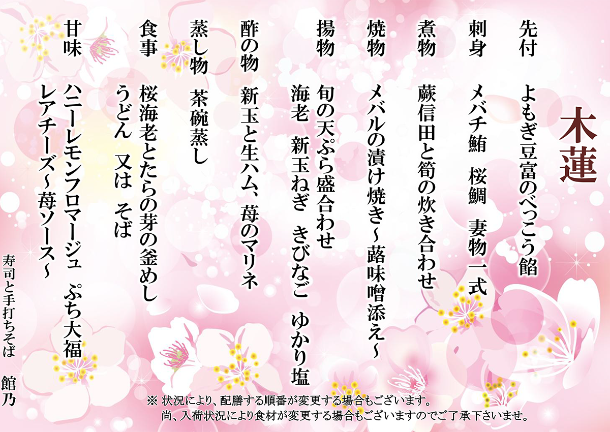 尚、入荷状況により食材が変更する場合もございますので御了承下さいませ。