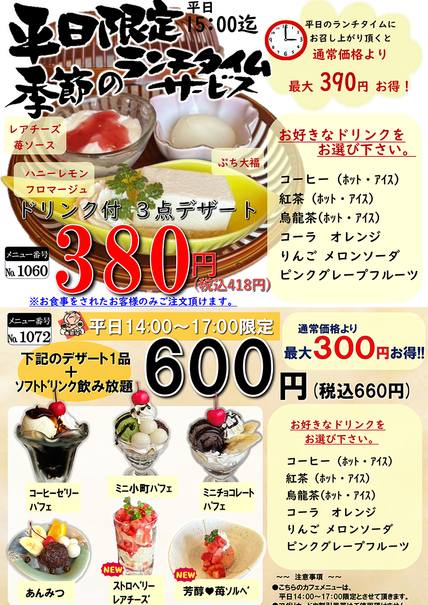 平日は14:00~17:00限定、大好評企画【デザート1品+ソフトドリンク飲み放題】も実施中!通常価格より最大300円お得☆デザート・ドリンクの内容はメニューをクリックしてご確認くださいませ。