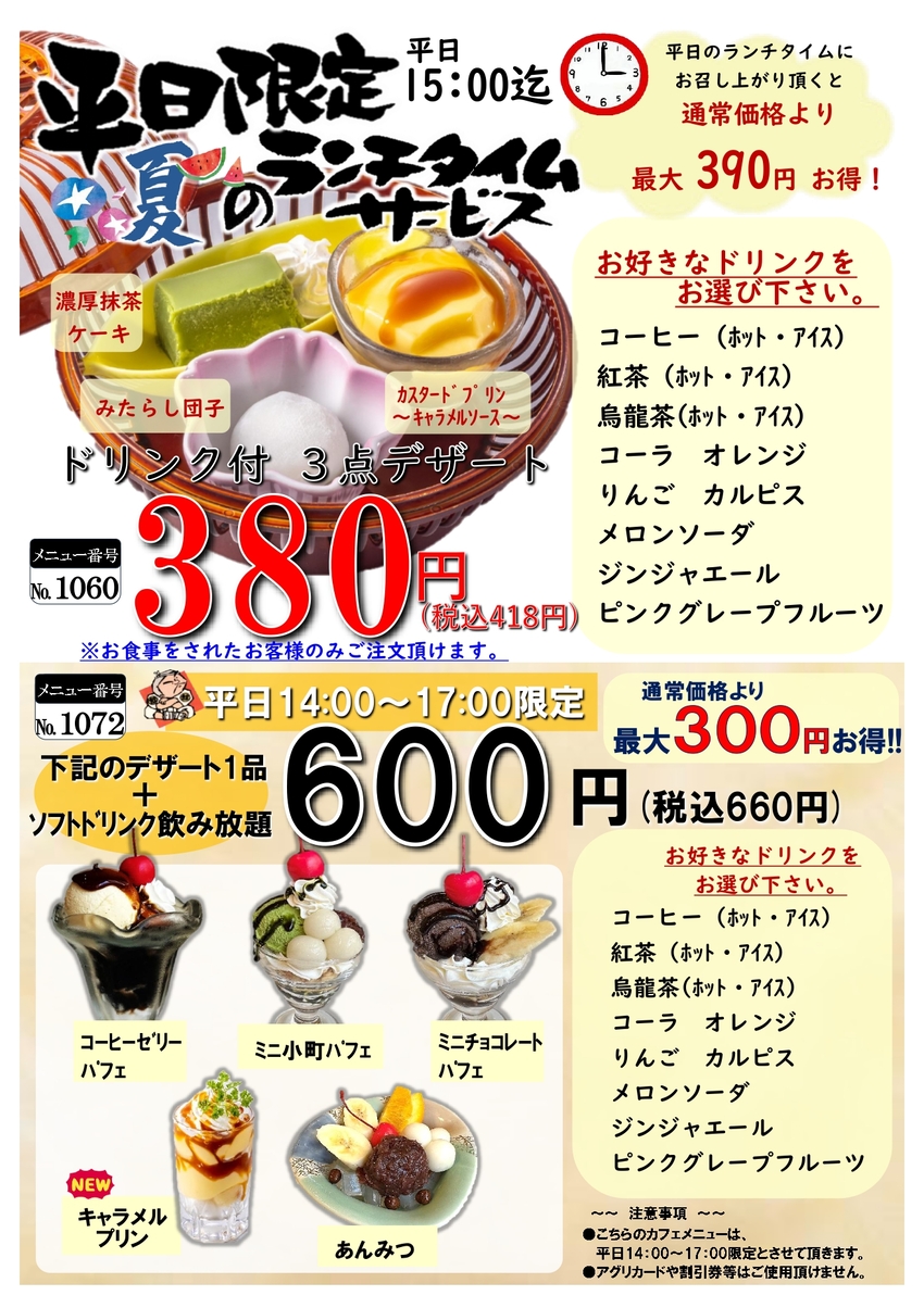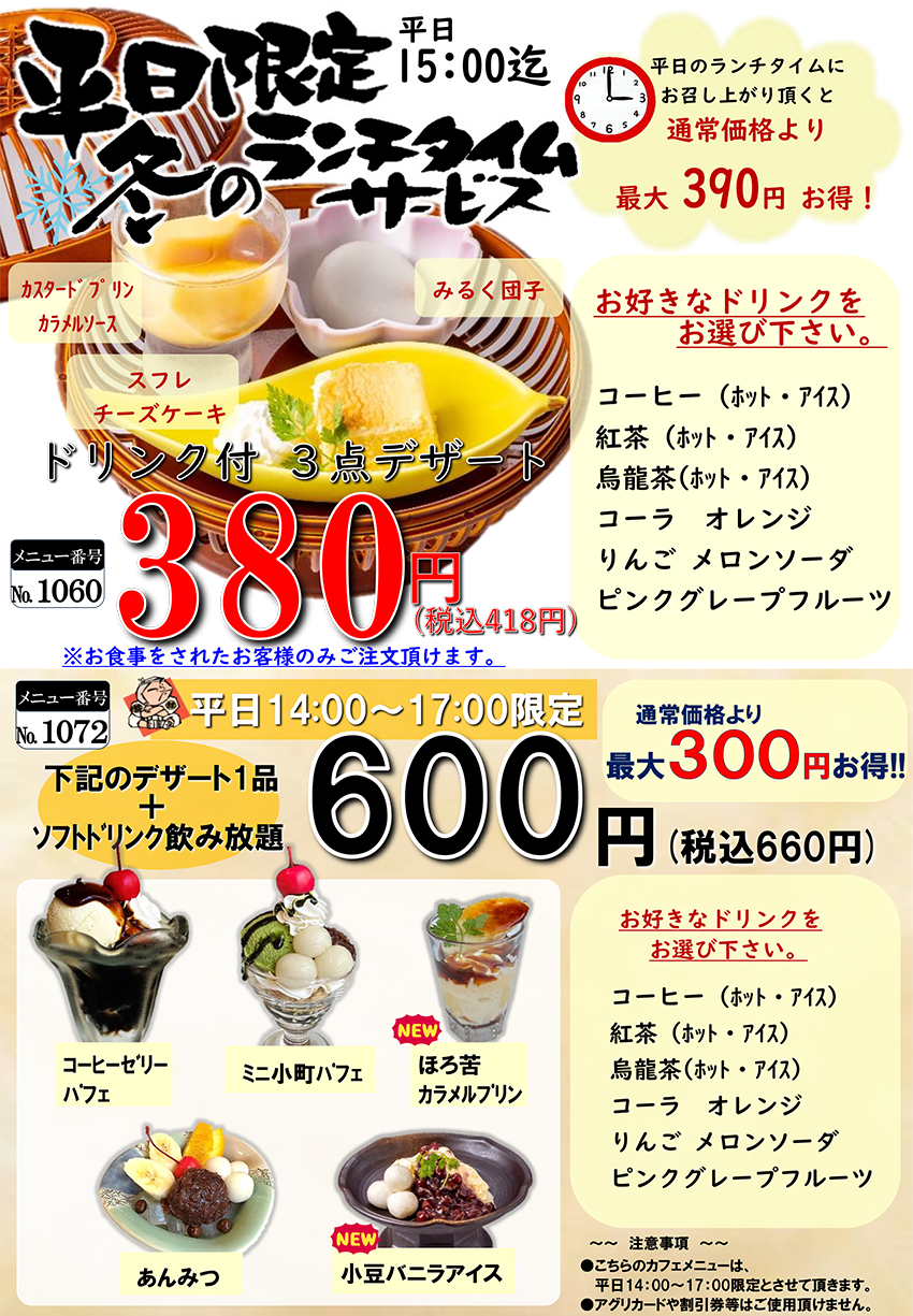 平日は14:00~17:00限定、大好評企画【デザート1品+ソフトドリンク飲み放題】も実施中!通常価格より最大300円お得☆デザート・ドリンクの内容はメニューをクリックしてご確認くださいませ。