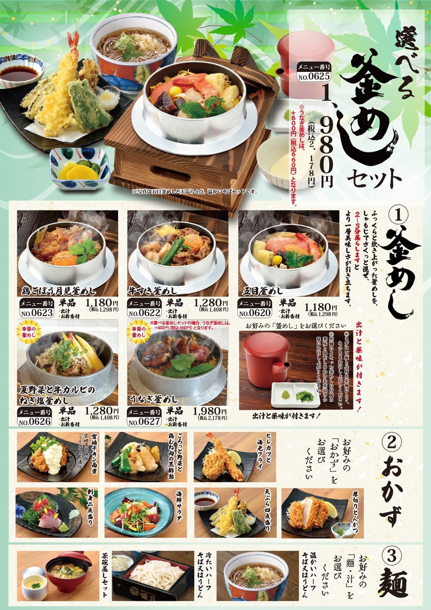 5種類の「釜めし」の中からお好きな釜めしと、「おかず」「麺・汁」もお好みのものをお選びいただけるので、色々な組み合わせで何通りもお楽しみいただけます!